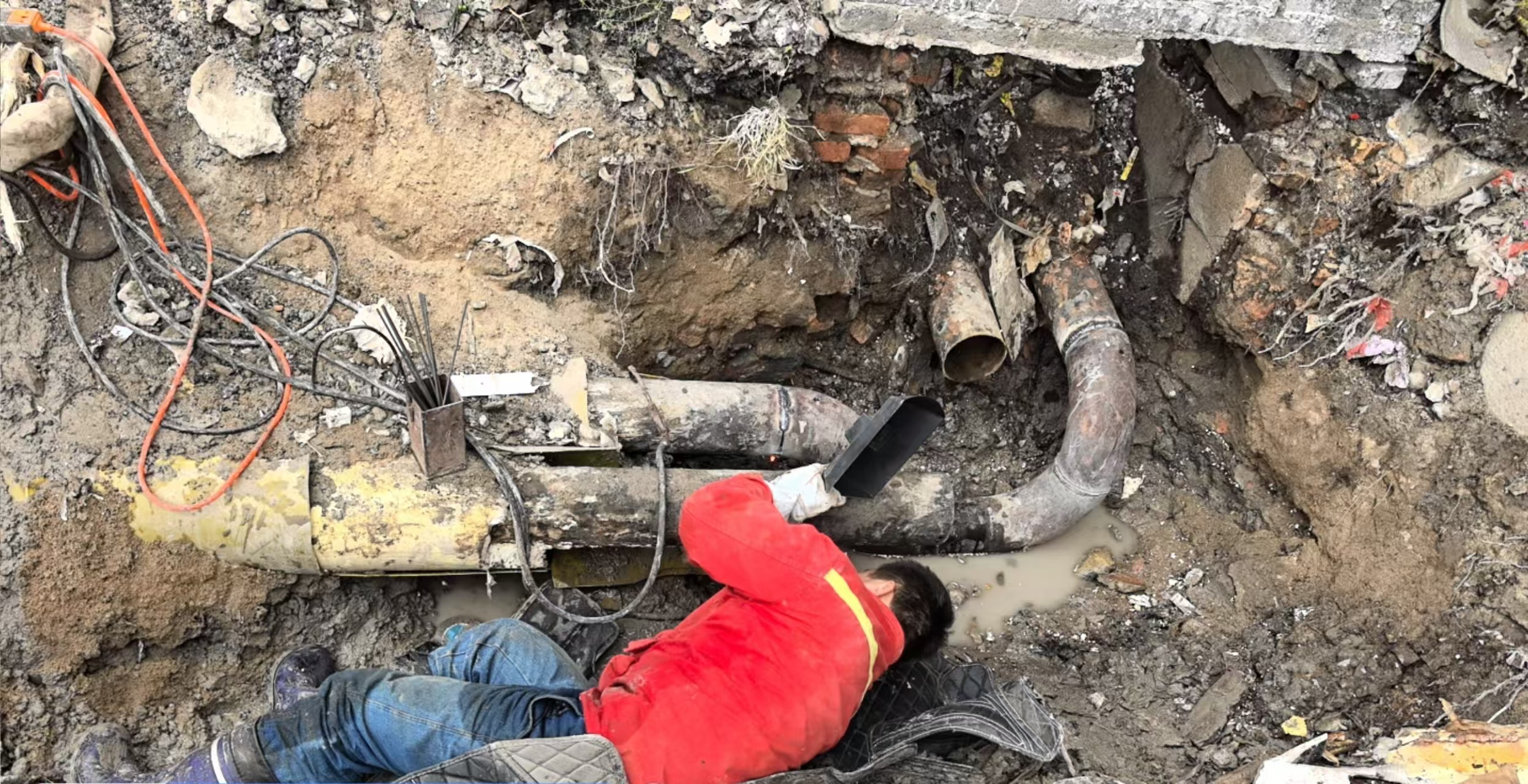 随后的两天,为了不影响居民用热,刘师傅决定采取带压运行的维修方案。这意味着,他们要在管道不停的情况下进行作业,难度和危险性都大大增加。热水从裂缝处不断喷溅而出,作业坑内热气蒸腾。刘师傅和同事们轮番上阵,在高温高湿的环境中持续工作。他们的衣服湿了又干,干了又湿,汗水和管道喷溅出的热水混在一起,模糊了双眼。