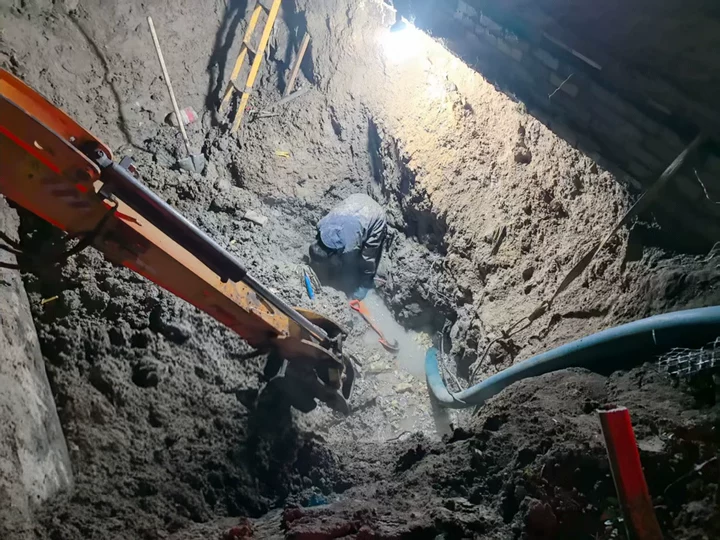 13日清晨,在公司领导的现场部署与指挥下,瀚城管理处主任亲自带领抢修队伍抵达现场,立即展开抢修作业。现场情况比预想的更为复杂:地下管线自来水、燃气、污水、雨排纵横交错,机械开挖风险极高。面对困局,团队展现出高度的智慧与韧性,果断采取“机械开挖与人工探挖相结合”的精准作业模式——挖掘机先行破除表层,随后维修人员跳入坑中,顶着刺骨的寒冷,用铁锹、甚至徒手进行精细探挖,小心翼翼地为挖掘机清理出安全作业面。