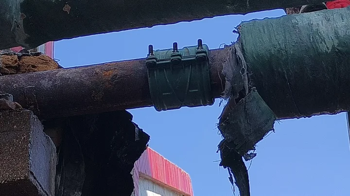 网格群内信息出现后,兴卧管理处主任高源第一时间在线响应,立即启动应急预案指挥调度。维修人员陈术海、周洪亮、刘淇在接到指令后,毫不犹豫,第一时间携带工具和设备从家中及单位赶赴现场。与此同时,高源主任也立刻从家中出发,奔赴抢修一线。经现场仔细勘查,确认为7-3号楼楼头处架空敷设的DN150二级供热管网发生泄漏。漏点位于较高位置的供热主管线上,且管线因长期运行腐蚀较为严重,增加了抢修难度和风险。面对夜间照明不足、作业空间受限、管线腐蚀易损等不利条件,高源主任现场协调指挥,维修团队沉着应对,为保障居民用户的供热不受影响,他们制定了安全可靠的抢修方案,选择带压打卡箍堵漏点。陈术海、周洪亮、刘淇三位同志凭借丰富的经验和专业技能,密切配合,操作精准,首先做好安全隔离,然后立刻对腐蚀泄漏管段带压作业。